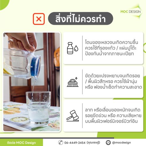 2 - ขัดด้วยแปรงหยาบ : อาจทำให้เฟอร์นิเจอร์เกิดรอยขีดข่วนและพื้นผิวเกิดการสึกหรอได้ แนะนำให้ใช้ผ้านุ่มหรือฟองน้ำเช็ดเพื่อทำความสะอาด