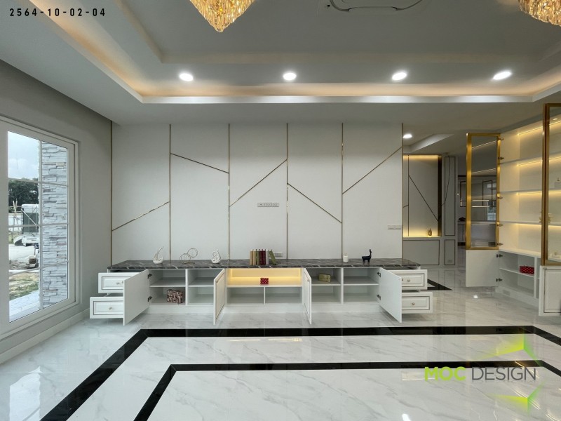 4. ชุดชั้นวางทีวีห้องนั่งเล่น ขนาด 4.73 x 3.00 m. วัสดุ HMR เมลามีน สีขาว 101-01 ท๊อปลายหิน 609-02 กรุยเชิงสแตนเลสสีทองเงา หน้าบานเมมเบรนสีขาวด้าน R01 ไฟ LED แสงวอร์ม