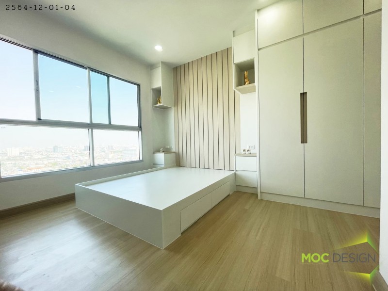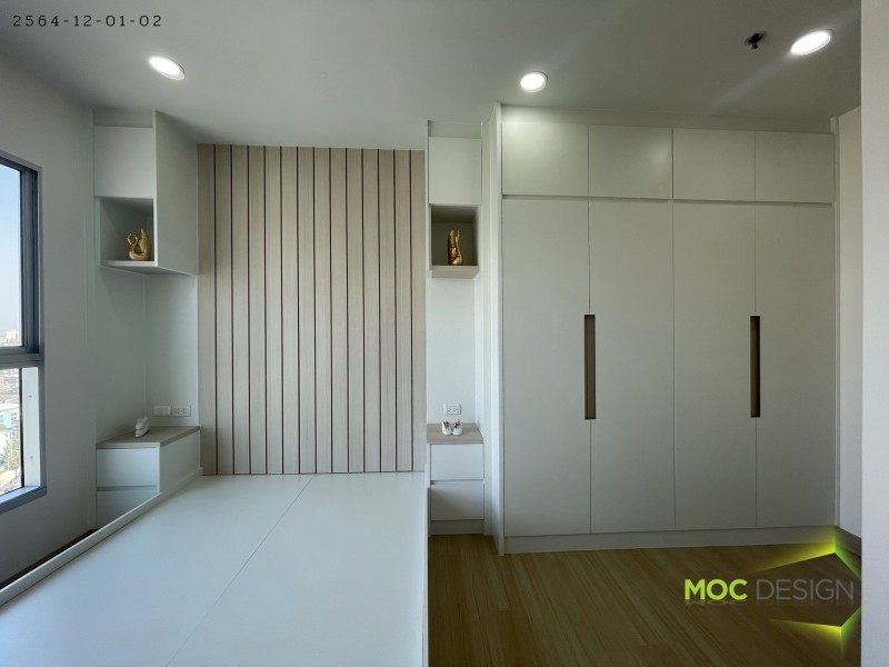 3. ชุดเตียง+กรุผนังหัวเตียงและตู้เก้บของ ขนาด 2.36 x 2.54 m. วัสดุ MDF เมลามีน สี ขาว 101-01 ตัดสี 6776-011