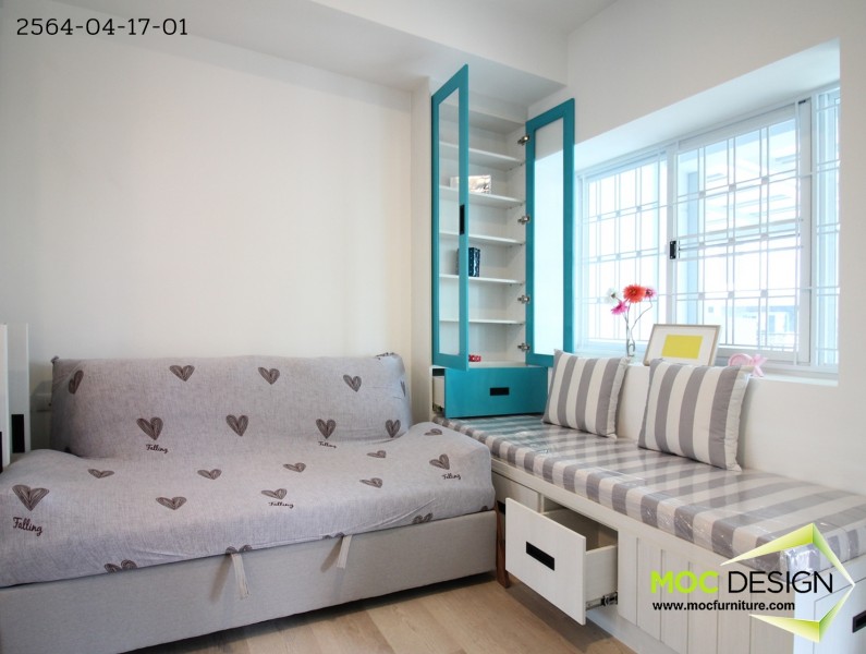 2. ชุดตู้เก็บของ+โซฟาเบด ขนาด 0.80 x 2.40 , 2.04 x 0.80 x 0.50 m.วัสดุ MDFเมลามีน สี 873-02 ตัดสี AY7 หน้าบานเฟรมไม้กระจกใส