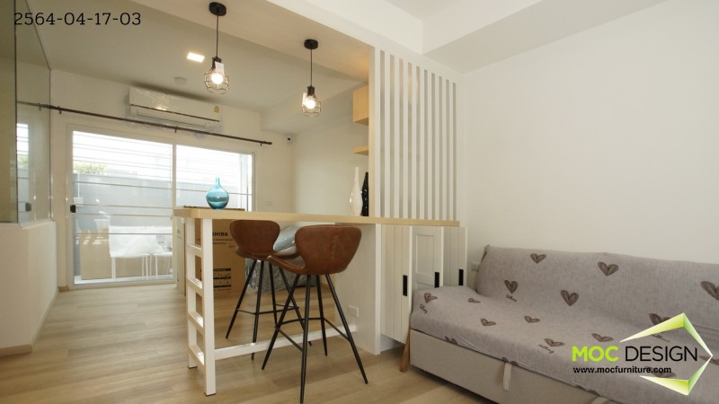 3. ชุดเคาท์เตอร์บาร์+ตู้โชว์+กรุฝ้าเพดาน ขนาด 3.35 x 2.40 m. วัสดุ MDFเมลามีน สี 873-02 ตัดสี 1169-02 หน้าบานเฟรมไม้กระจกใส ขาเหล็กพ่นสีขาว