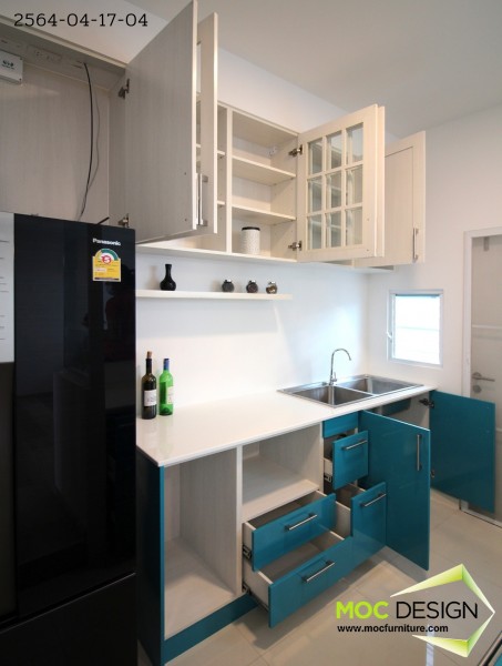 5. ชุดครัวตู้ล่าง ขนาด 2.15 x 0.86 m. วัสดุ HMR เมลามีน สี 873-02 ตัดสี AY7 ท๊อปหินแกรนิต คริสตัลไวท์