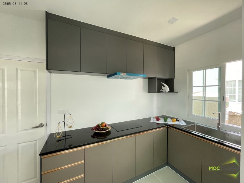 3. ชุดครัวตัว L ขนาด 2.65 + 1.20 x 2.70 m. วัสดุ HMR เมลามีน สี 7651-01 หน้าบานปิดลามิเนต 5342UN ท๊อปหินแกรนิตดำเกล็ดทอง