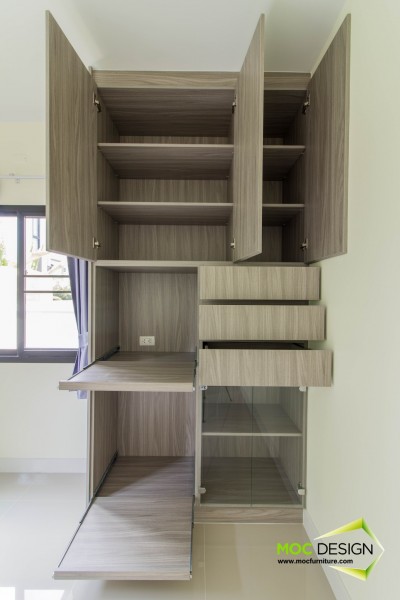 7. ตู้เก็บของ ขนาด 0.71 x 2.60 m. + 1.4 m. วัสดุ MDF เมลามีน สี Grain 5618 (โครงตู้) หน้าบานพ่นสี ไฮกรอสสีชมพู