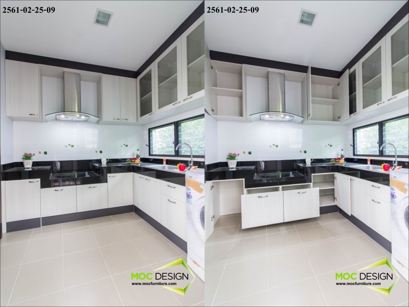 8. ชุดครัว ขนาด 2.28 + 2.14 m. วัสดุ MDF เมลามีน สี White Pine 5357w-05 ตัดสี Graphite 3200 บานเฟรมกระจกใส