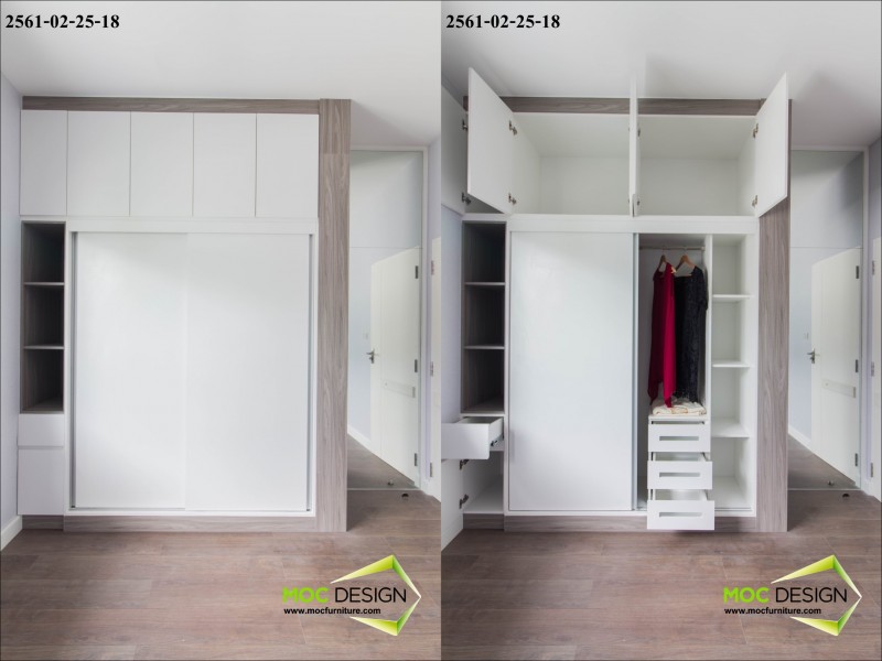 12. ตู้เสื้อผ้า ขนาด 2.56 x 2.80 m. วัสดุ MDF เมลามีน สี Oak 5632-07 ตัดสีขาว หน้าบานกระจกเงา