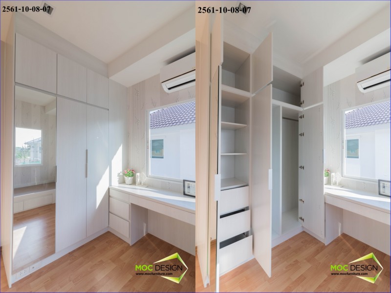 7. ตู้เสื้อผ้า+โต๊ะทำงาน ขนาด 1.86 x 2.80 m. / 1.34 x 0.75 m. วัสดุ MDF เมลามีน สี Ladinia 873 หน้าบานกระจกเงา
