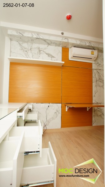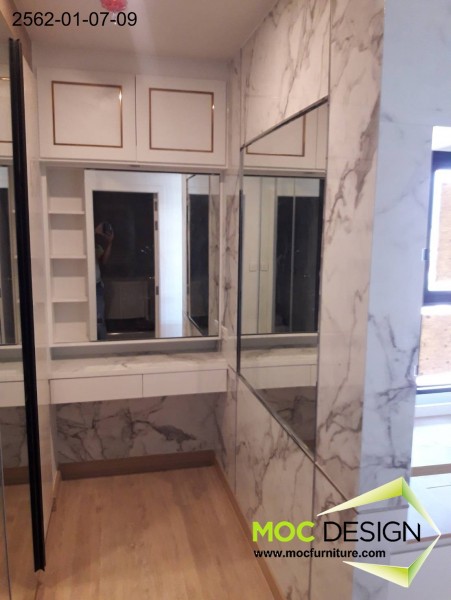 7. ตู้เก็บของ+โต๊ะทำงาน ขนาด 1.38+1.55+2.80 x 2.55 m. วัสดุ MDF เมลามีน สีขาวปิดผิวด้วยลามิเนต 3460HG บานเฟรมอะลูมิเนียม กระจกเงาทอง กระจกใส