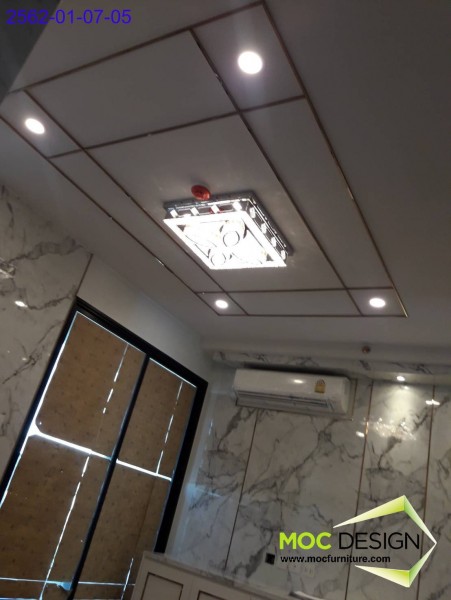 5. งานฝ้าเพดาน ขนาด 1.56 x 2.92 m. งานฝ้าฉาบเรียบใส่ไฟและกรุยเชิงสีทองแดง