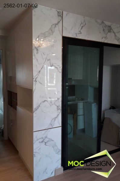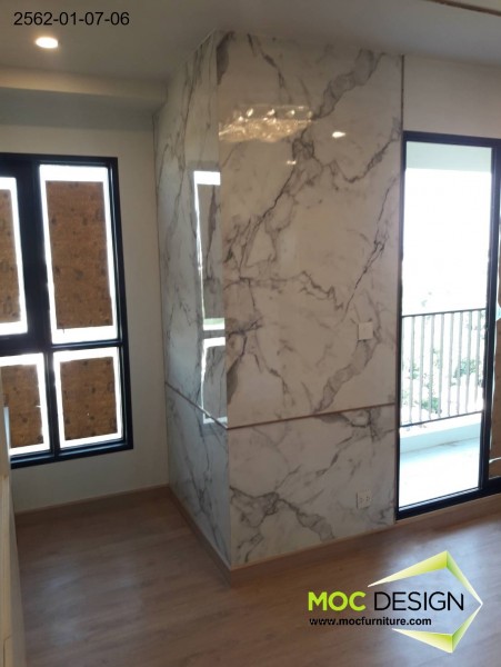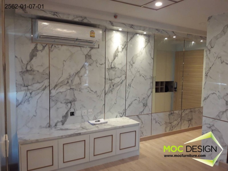 1. กรุผนังลายหินอ่อนชุดวางทีวี ขนาด 4.78 x 2.55 m. วัสดุ MDF เมลามีน สีขาว ปิดผิวด้วยลามิเนต 3460HG กรุยเชิงสีทองแดง กระจกเงา