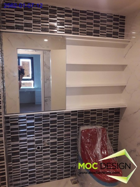9. กรุผนังกระจกเงา + โต๊ะแป้ง ขนาด 1.03 + 1.53 x 2.55 m. วัสดุ MDF เมลามีน สีขาวปิดผิวด้วยลามิเนต 3460HG กรุยเชิงสีทองแดง กรุยเชิงสีเงิน กระจกเงา