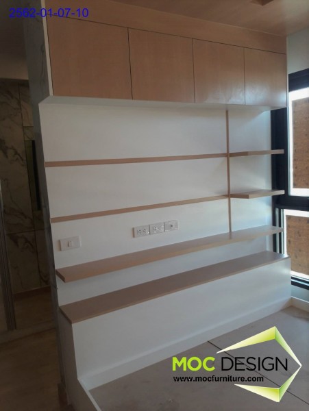 8. กรุผนัง+ชั้นวาง+โต๊ะพับ ขนาด 3.09 x 2.55 m. วัสดุ MDF เมลามีน สี Teak 12523 ปิดผิวด้วยลามิเนต 3460HG