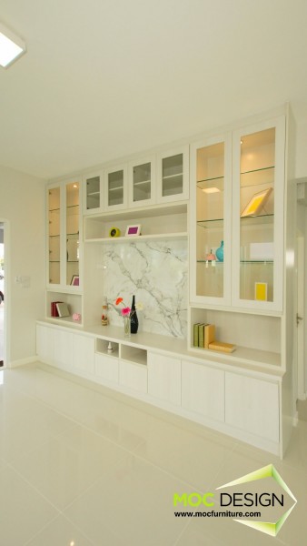 1. ชุดวางทีวี + ตู้โชว์ ขนาด 3.32 x 2.65 m. วัสดุ MDF เมลามีน สี Ladinia 873-02 ชั้นกระจกใส ลามิเนตลายหินอ่อน