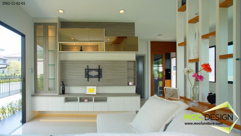 1. ชุดวางทีวี ขนาด 3.09 x 2.60 m. วัสดุ MDF เมลามีน สี White pine 5357 ตัดสี Wallnut 5617 กระจกเงาทอง