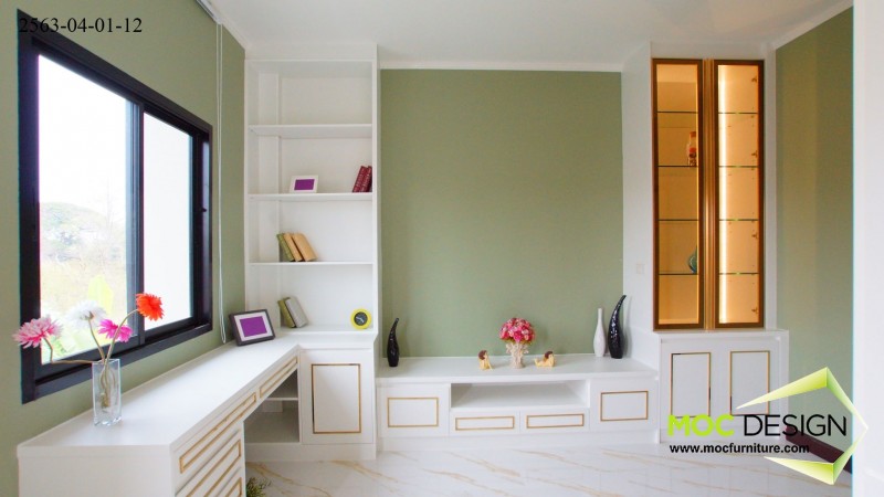 2. ชุดโต๊ะทำงานพร้อมโต๊ะทำงานกรุผนังตู้เก็บของ ขนาด 1.17 x 3.00 m. วัสดุ MDF เมลามีน สี 615-02 โครงภายในสี Cassia Siamea 4032-04 กระจกเงาทอง กรุยเชิงสีทอง