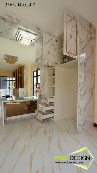 7. ตู้โชว์+โต๊ะทานอาหาร ขนาด 2.40 x 3.10 m. วัสดุ MDF เมลามีน สี 615-02 โครงภายในสี Cassia Siamea 4032-04 กระจกเงาทอง กรุยเชิงสีทอง