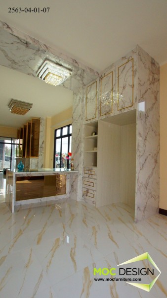 5. ตู้โชว์ ขนาด 3.17 x 3.15 m. วัสดุ MDF เมลามีน สี 615-02 โครงภายในสี Cassia Siamea 4032-04 เฟรมอะลูมิเนียมสีทอง กรุยเชิงทอง