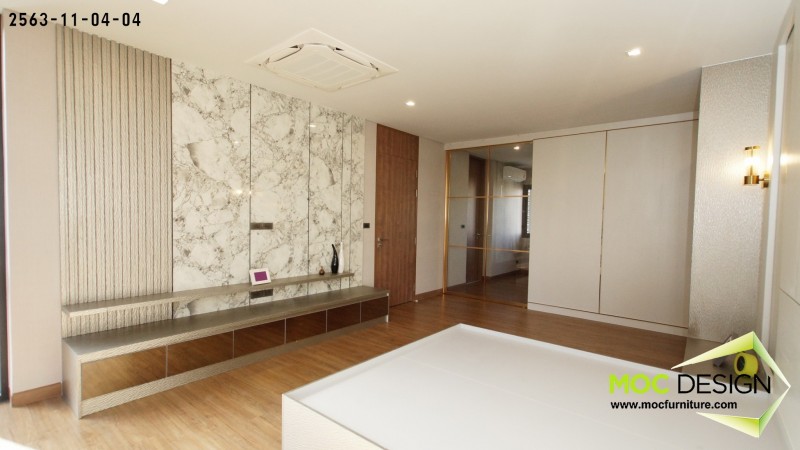 5. กรุผนังบานเลื่อนกั้นห้อง ขนาด 3.94 x 2.40 m. วัสดุ HMR เมลามีน สี 3258-01 , ลามิเนต 7157TW เฟรมอลูมิเนียมสีทอง กระจกใส