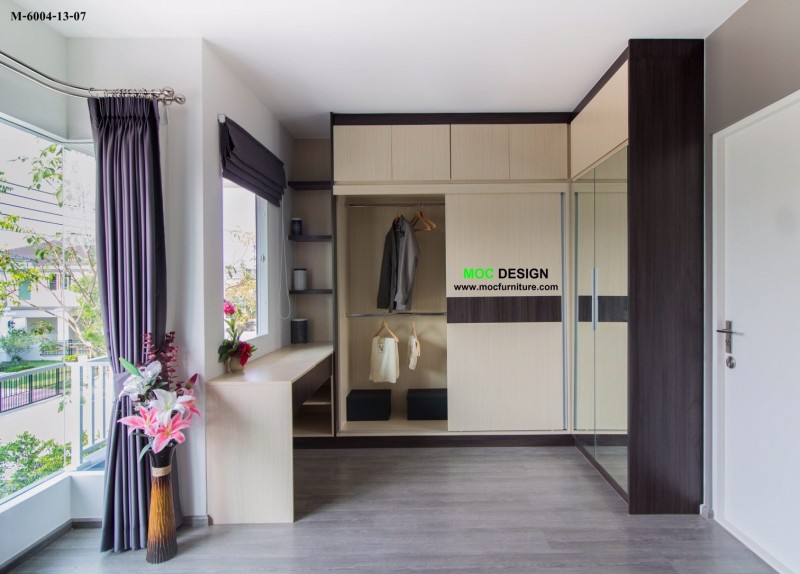 8. ตู้เสื้อผ้า + โต๊ะแป้ง ขนาด 1.20+0.60 m. วัสดุ MDF เมลามีน สี White 101 + Oak 1169