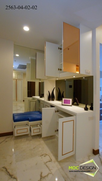 3. ตู้โชว์+โซฟาเบด ขนาด 1.60 x 2.64 m. , 1.05 x 0.60 m. วัสดุ MDF เมลามีน สี White 101-01 กรุยเชิงสีพิงค์โกลด์ หน้าบานกระจกสีพิงค์โกลด์ กรุผนังกระจกเงาชา กรุผนังกระจกเงา เบาะ Pu สี 4010