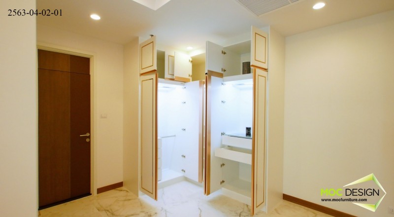 2. ตู้เสื้อผ้าตัว L ขนาด 1.70 x 2.64 m. วัสดุ MDF เมลามีน สี White 101-01 กรุยเชิงสีพิงค์โกลด์