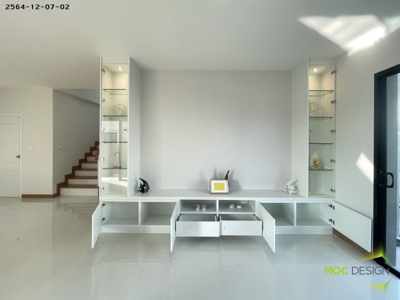 1. ชุดชั้นวางทีวี ขนาด 3.64 x 2.66 m. วัสดุ HMR เมลามีน สี White 101-01 กระจกใส