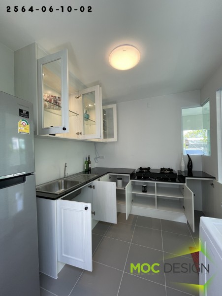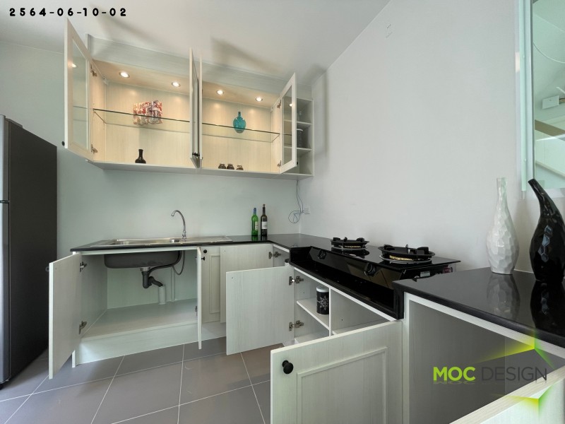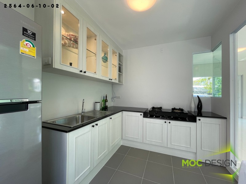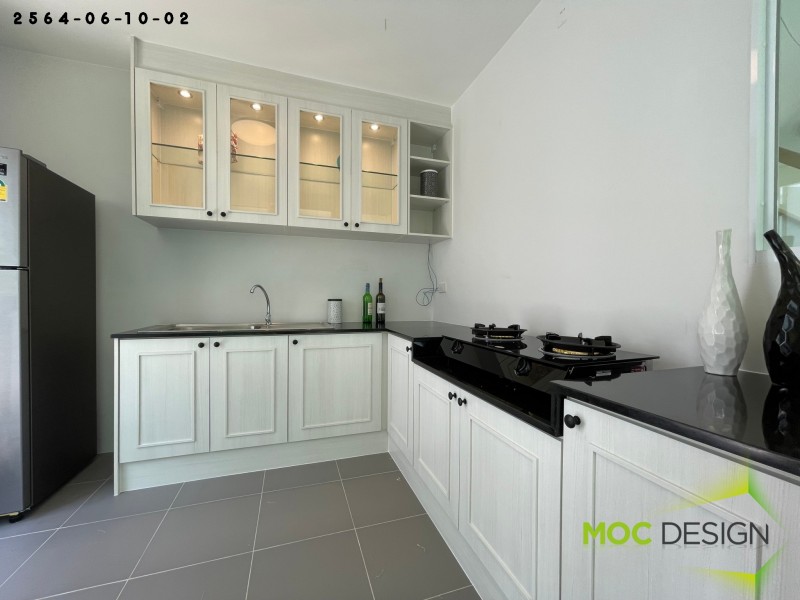 3. ชุดครัวตัว L ขนาด 1.98 + 2.48 x 2.75 m. วัสดุ HMR เมลามีน สี Ladinia 873-02 ท๊อปหินแกรนิต ดำเกล็ดทอง บานกระจกใส