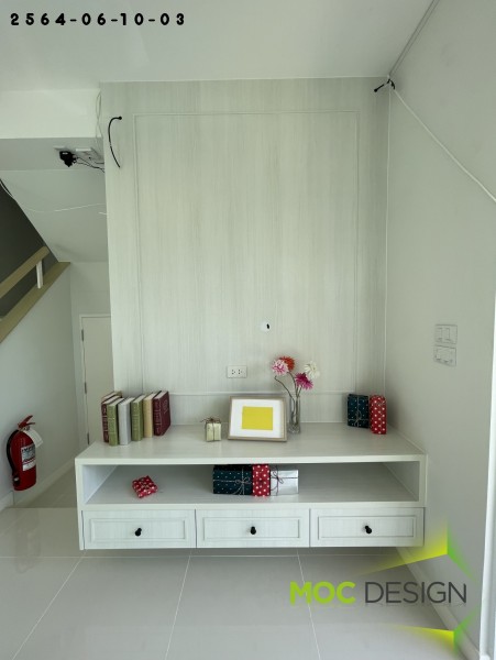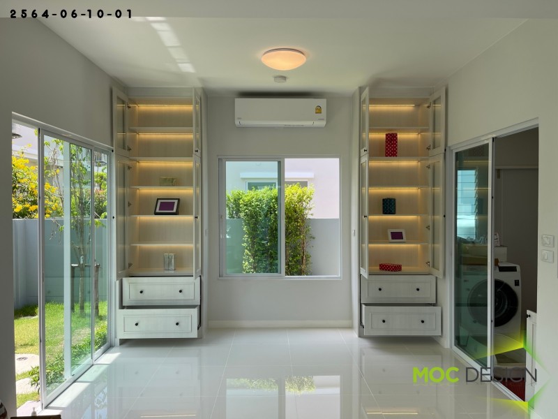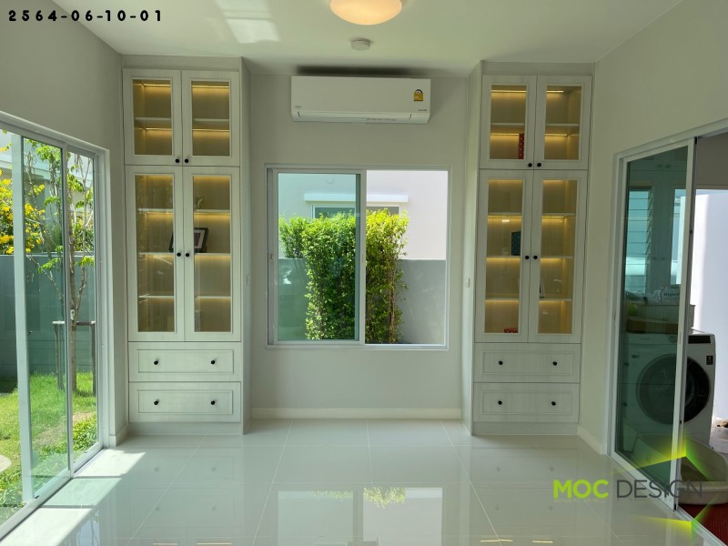2. ชุดตู้โชว์ ขนาด  0.85 x 2.75 m.  วัสดุ HMR เมลามีน สี Ladinia 873-02  บานกระจกใส